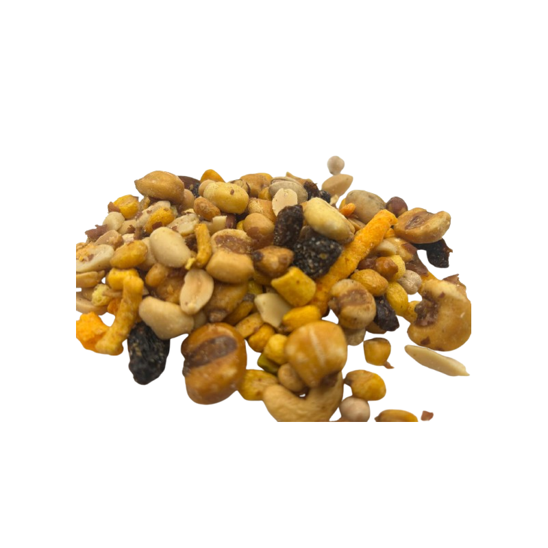 Revuelto de frutos secos, frutas deshidratadas y snacks.
